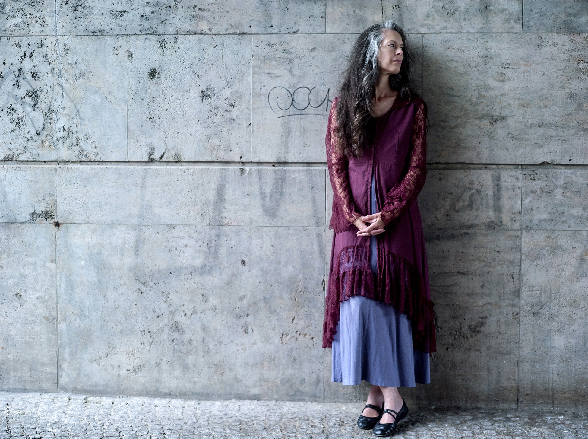 Haare: | braun, graumeliert, lang, wellig |